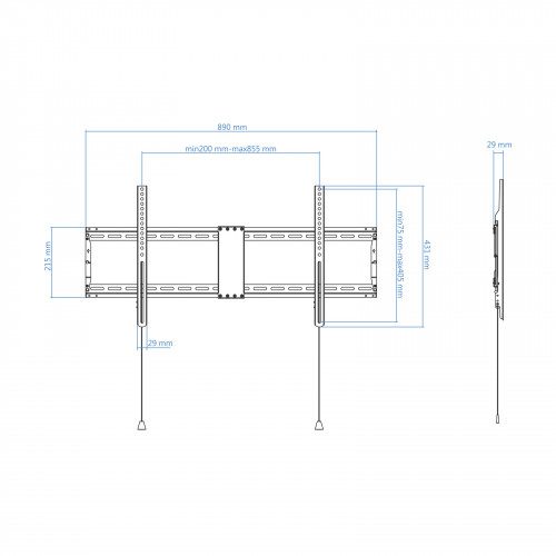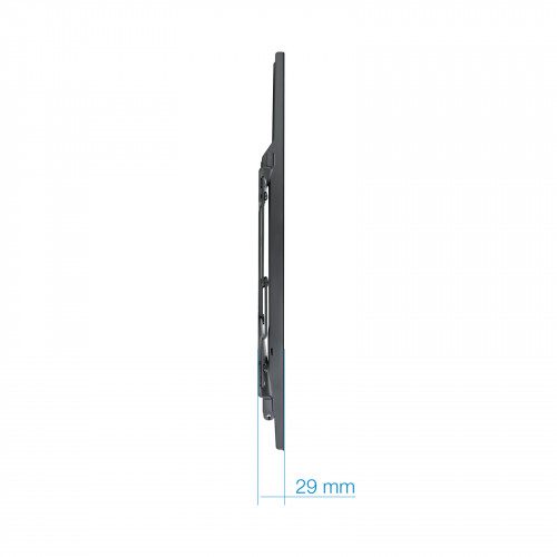 Soporte de pared para pantallas 43″ – 90″- Pantallas soportadas: 43″- 90″- Compatible con VESA: 200×200, 300×200, 300×300, 400×200, 400×300, 400×400, 600×400 y 800×400- Peso máximo soportado de pantalla: 70 kg- Distancia de pared: 29 mm- Incluye nivel de burbujas- Color: Negro- Peso neto: 2,36 kg. Peso bruto: 2,55 kg- Medidas del embalaje: 450x87x75 mm
