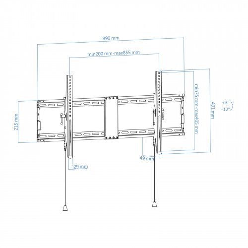 Soporte de pared para pantallas 43″ – 90″- Pantallas soportadas: 43″- 90″- Compatible con VESA: 200×200, 300×200, 300×300, 400×200, 400×300, 400×400, 600×400 y 800×400- Peso máximo soportado de pantalla: 70 kg- Ángulo de inclinación: +3°/-12°- Distancia de pared: 49 mm- Color: Negro- Peso neto: 2,90 kg. Peso bruto: 3,05 kg- Medidas del embalaje: 450x122x80 mm