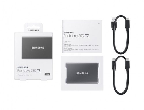 Samsung T7. SDD, capacidad: 2000 GB. Conector USB: USB Tipo C, Versión USB: 3.2 Gen 2 (3.1 Gen 2). Velocidad de lectura: 1050 MB/s, Velocidad de escritura: 1000 MB/s. Protección mediante contraseña, Color del producto: Gris
