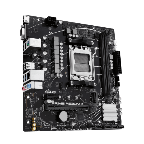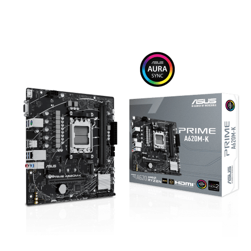 ASUS PRIME A620M-K. Fabricante de procesador: AMD, Socket de procesador: Zócalo AM5, Procesador compatible: AMD Ryzen 5 7th Gen, AMD Ryzen 7 7th Gen, AMD Ryzen 9 7th Gen. tipos de memoria compatibles: DDR5-SDRAM, Memoria interna máxima: 96 GB, Canales de memoria: Doble canal. Interfaces de disco de almacenamiento soportados: M.2, SATA III, Tipos de unidades de almacenamiento admitidas: HDD & SSD. Tipo de interfaz ethernet: Ethernet rápido, Gigabit Ethernet. Componente para: PC, Factor de forma: micro ATX, Familia del chipset: AMD