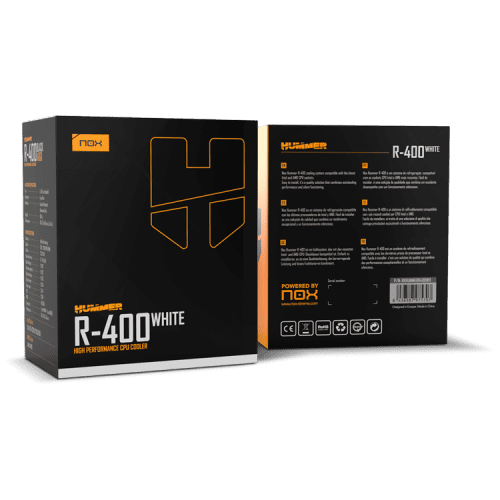 Nox Hummer R-400 es un disipador de CPU con un sobrio y elegante diseño total black/blanco. Incluye un ventilador de 120 mm que proporciona una óptima disipación del calor, velando por mantener la temperatura del interior del PC a niveles bajos.