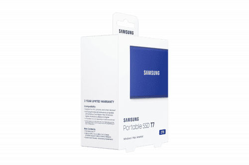 Samsung Portable SSD T7. SDD, capacidad: 2000 GB. Conector USB: USB Tipo C, Versión USB: 3.2 Gen 2 (3.1 Gen 2). Velocidad de lectura: 1050 MB/s, Velocidad de escritura: 1000 MB/s. Protección mediante contraseña, Color del producto: Azul