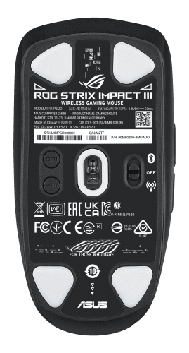 ASUS ROG Strix Impact III Wireless. Factor de forma: Ambidextro. Tecnología de detección de movimientos: Óptico, Interfaz del dispositivo: RF Wireless + Bluetooth, Resolución de movimiento: 36000 DPI, Tipo de botones: Botones presionados, Cantidad de botones: 6, Tipo de desplazamiento: Rueda, Aceleración (máx.): 50 G. Iluminación de color: Multi. Fuente de energía: Baterías. Color del producto: Negro