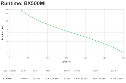 APC Back-UPS. Topología UPS: Línea interactiva, Capacidad de potencia de salida (VA): 0,5 kVA, Potencia de salida: 300 W. Tipo de salida AC: C13 acoplador, Conector: C14 acoplador, Cantidad de salidas AC: 3 salidas AC. Tecnología de batería: Sealed Lead Acid (VRLA), Voltaje de la pila: 12 V, Vida útil de la batería (máx.): 5 año(s). Factor de forma: Torre, Color del producto: Negro, Longitud de cable: 1,5 m. Ancho: 98 mm, Profundidad: 310 mm, Altura: 138 mm