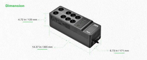 APC BE1050G2-GR. Topología UPS: En espera (Fuera de línea) o Standby (Offline), Capacidad de potencia de salida (VA): 1,05 kVA, Potencia de salida: 600 W. Tecnología de batería: Plomo-ácido, Capacidad de la batería: 9 Ah, Voltaje de la pila: 12 V. Factor de forma: Escritorio, Color del producto: Negro. Certificados de conformidad: CE, EAC. Ancho: 130 mm, Profundidad: 365 mm, Altura: 120 mm
