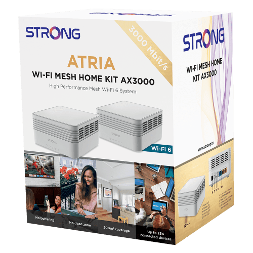 Strong MESHKITAX3000. Color del producto: Blanco, Tipo de antena: Interno, Tipo de producto: Sistema de malla. Banda Wi-Fi: Doble banda (2,4 GHz / 5 GHz), Estándar Wi-Fi: Wi-Fi 6 (802.11ax), Tasa de transferencia de datos WLAN (máx.): 2976 Mbit/s. Frecuencia del procesador: 0,9 GHz. Voltaje de salida de adaptador AC: 12 V, Corriente de salida de adaptador AC: 2 A. Ancho: 128 mm, Profundidad: 128 mm, Altura: 73 mm