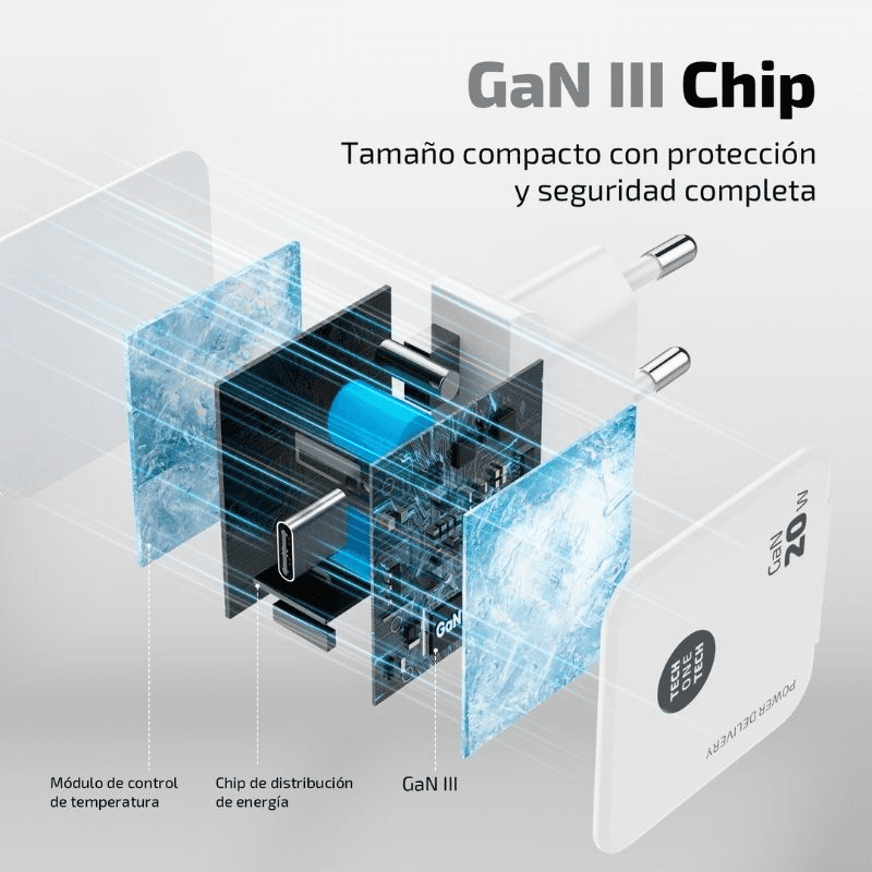 Cargador ultrarrápido con tecnología GaN Power Delivery 3.0 (PD) 20W, color blanco. Carga hasta un 400% más rápido que un cargador estándar de 5W. Compatible con dispositivos anteriores. Conector tipo USB-C de 3A. Este cargador permite cargar dispositivos como tabletas, móviles, consolas, baterías, auriculares, etc.