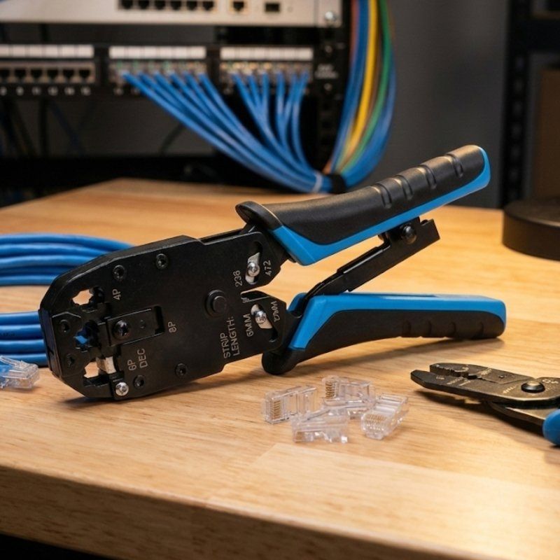 Crimpadora PHASAK TD 019 para RJ11/RJ12/RJ45 con topes de profundidad y herramientas integradas de corte y pelado. Precisión y repetibilidad en cada conector; pensada para instalaciones de voz/datos.