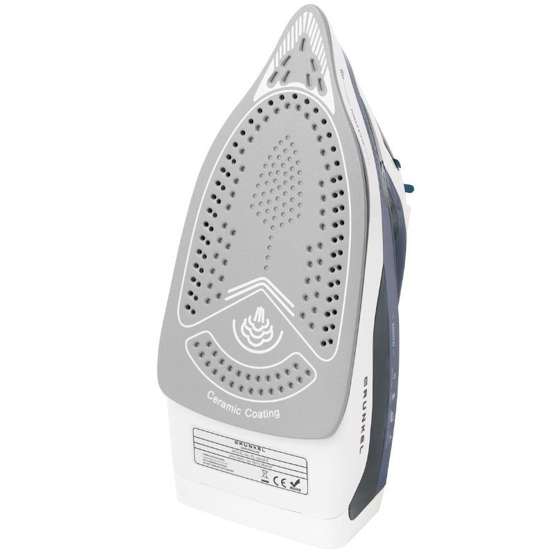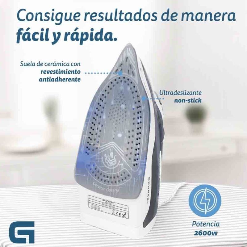 Plancha de GRUNKEL PL-2600CE, 2600W, suela cerámica, vapor 20–25 g/min, golpe 120 g/min, depósito 370 ml, autolimpieza y autoapagado.