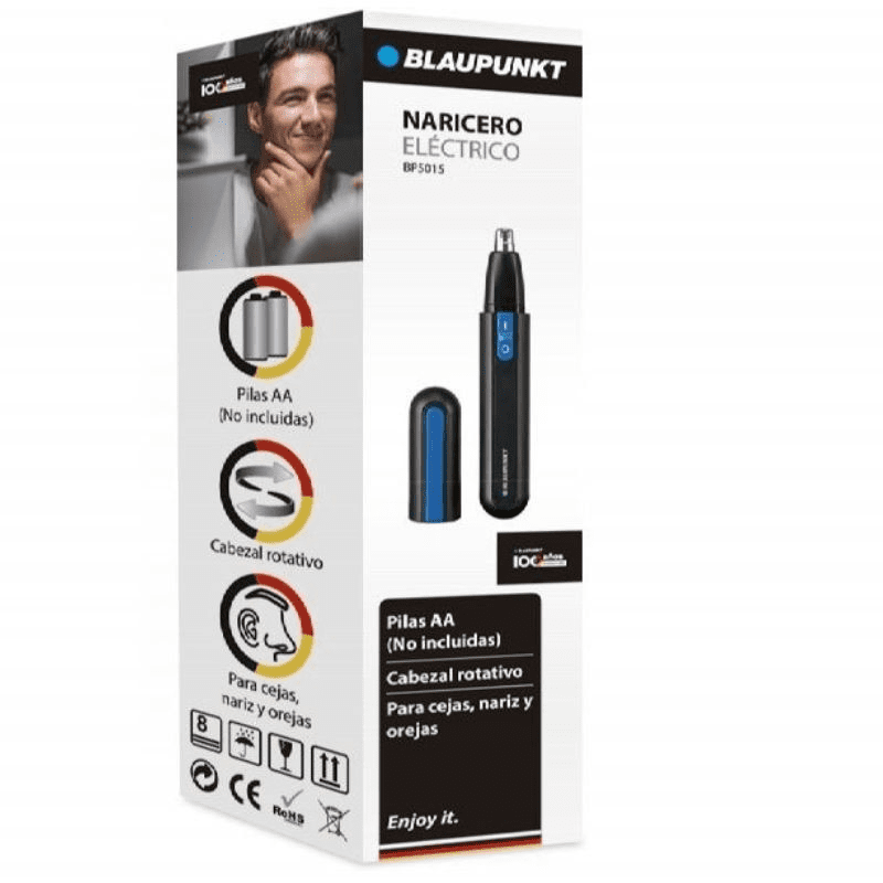 Blaupunkt BP5015 es un naricero eléctrico compacto con cabezal rotativo y alimentación a 1 pila AA para eliminar vello de nariz, orejas y retoques en cejas con precisión y bajo ruido. El cabezal se lava bajo el grifo y el cuerpo está protegido contra salpicaduras.