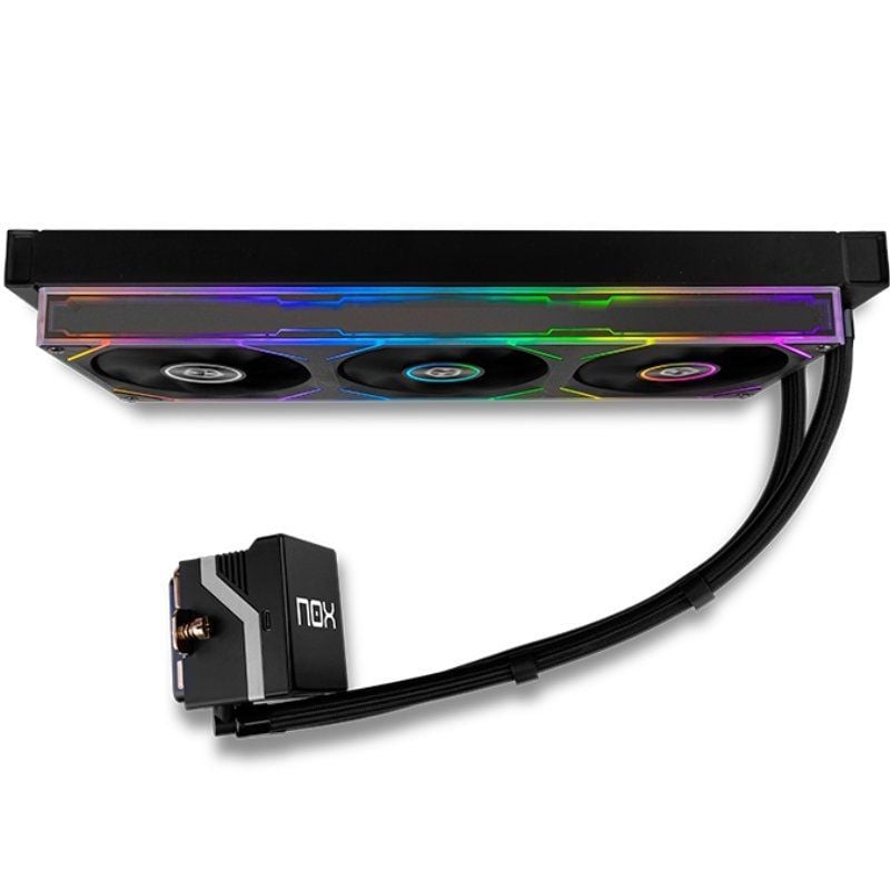 Disponible en color negro y blanco, este sistema de refrigeración líquida de Nox está compuesta por tres ventiladores con rodamiento hidraúlico, radiador de 360 mm y aletas aerodinámicas que facilitan la reducción de turbulencias entre radiador y ventilador.