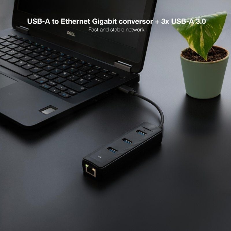 - Tipo: Concentrador USB-A 3.0 con 3 puertos USB-A 3.0 y Ethernet RJ45