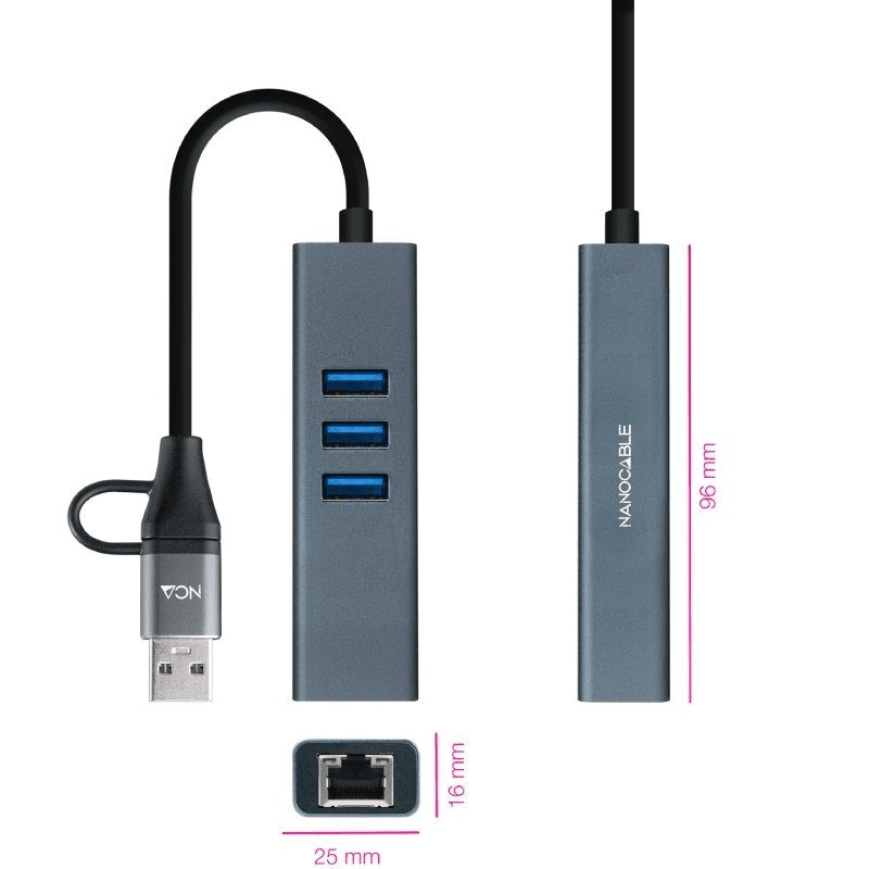 Hub usb + usb tipo-c 3.0 nanocable 10.03.0412/ 3xusb/ 1xrj45/ gris Interfaz:USB 3.0 , USB Tipo-C ;Numero de Puertos:1 RJ45, 3 USB-A;Tipo:USB;
