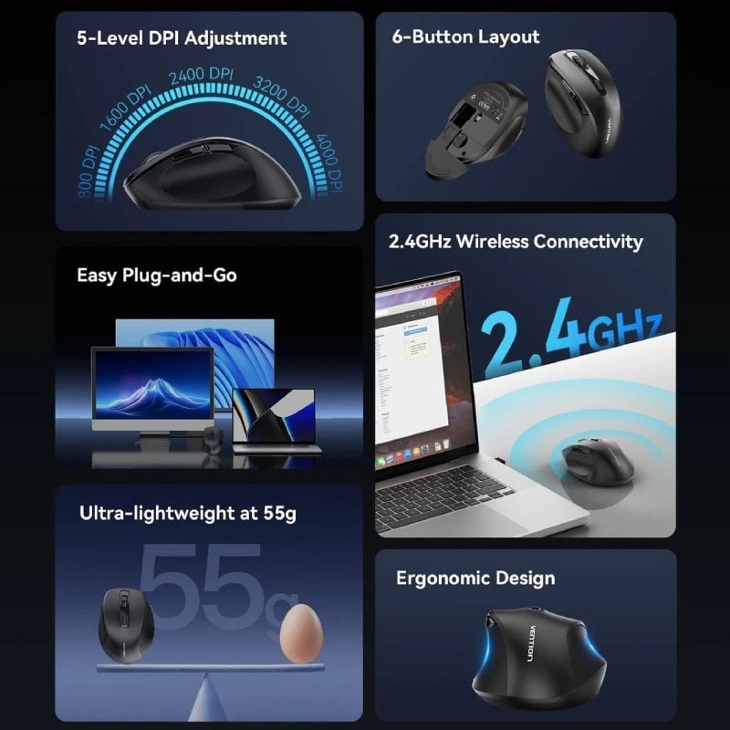 Vention Raton ergonomico inalambrico 6 Botones 2.4Ghz 55gr 4000dpi (ajustable) KTHB0 Negro