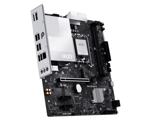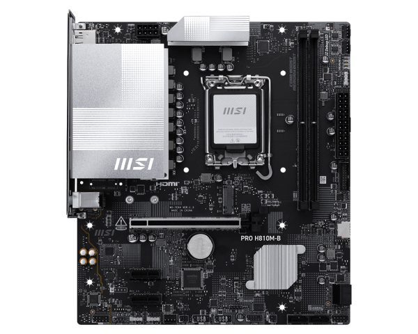 Con un diseño sobrio en tonos plateados, la MSI PRO H810M-B encaja perfectamente en sistemas negros o blancos. Forma parte de la Serie PRO de MSI, orientada a usuarios que buscan fiabilidad, eficiencia y facilidad de instalación.