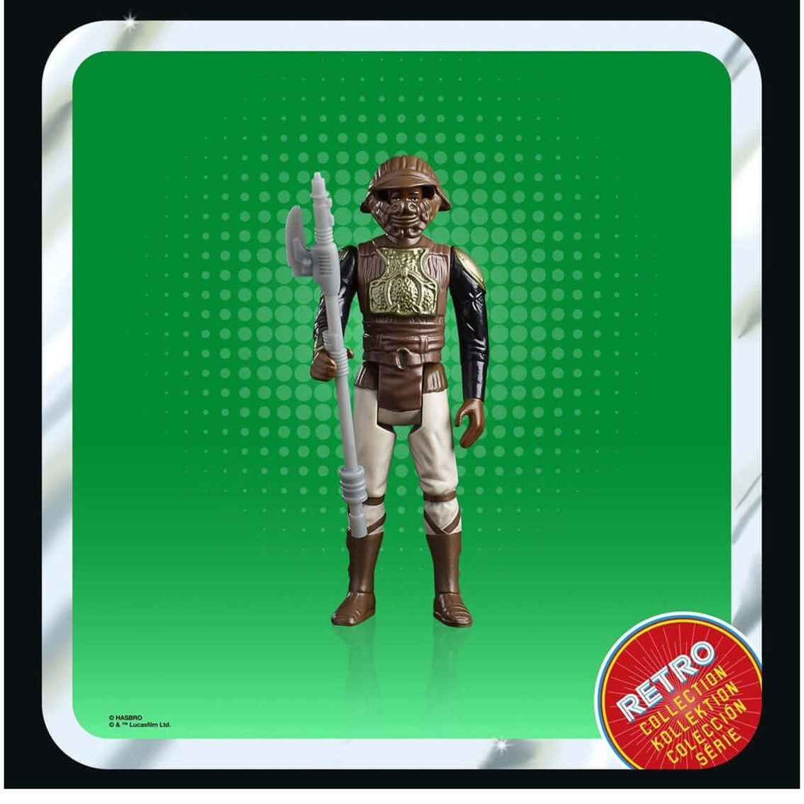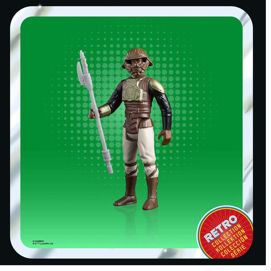 Esta figura a escala de 9,5 cm de la Colección Retro fue diseñada para reproducir la apariencia de Lando Calrissian (guardia de esquife) en la película Star Wars: El retorno del Jedi. La figura tiene diseños y detalles inspirados en las figuras Star Wars de los años 70.