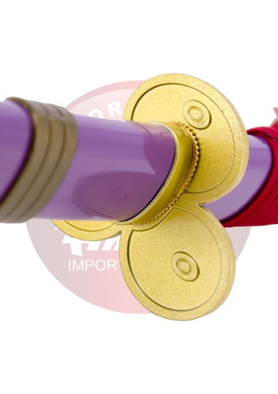 Con una longitud total de 103 cm, esta katana presenta una hoja de acero sin filo en acabado negro, decorada con detalles en amarillo y verde que reproducen fielmente el estilo del manga. Su vaina lila con detalles dorados y cordaje rojo refuerzan su presencia visual, mientras que el mango lila decorado en dorado completa un conjunto estético espectacular.