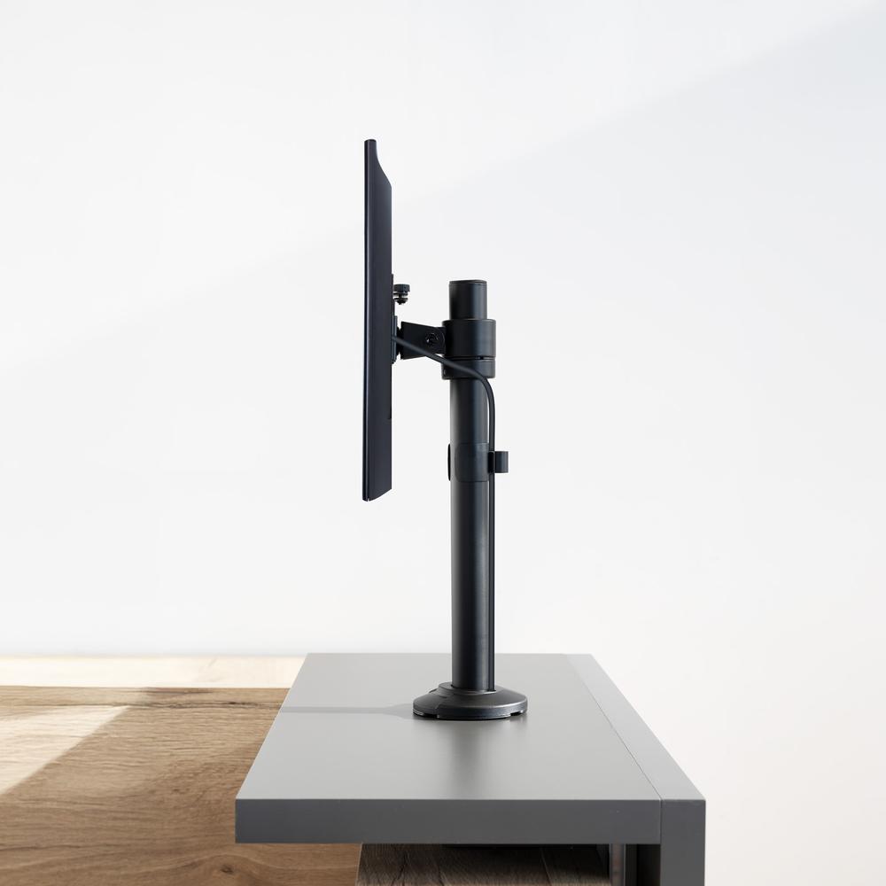 El sistema de montaje mediante tornillo pasante asegura una fijación firme sobre el escritorio, con la opción de atornillar la base para mayor estabilidad. Además, incorpora un sistema de gestión de cables que contribuye a mantener el espacio ordenado y libre de enredos.