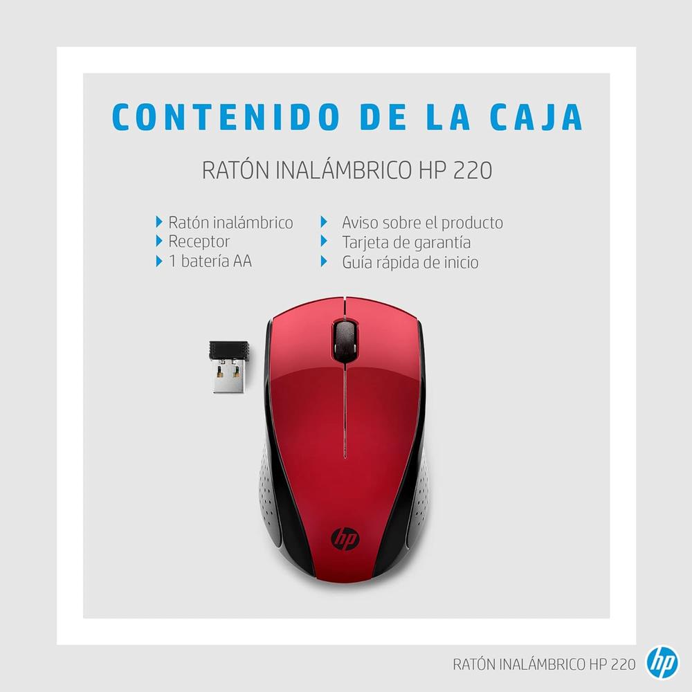 Contenido de la caja: Ratón inalámbrico HP 220, 1 batería AA, receptor USB de 2,4 GHz, guía rápida, tarjeta de garantía y documentación legal