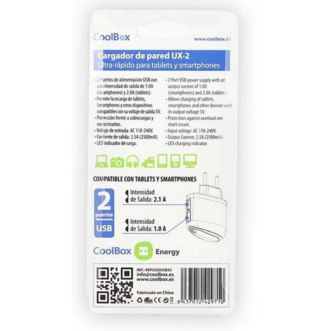 CoolBox UX-2. Tipo de cargador: Interior, Alimentación: Corriente alterna,