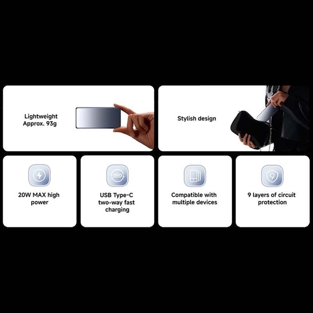 La Xiaomi Ultra Slim es una Power Bank de 5000 mAh con un diseño ligero de aproximadamente 93 gramos, ideal para llevarla cómodamente a cualquier lugar. Así pues, su elegante estética metálica se complementa con una alta velocidad de carga de hasta 20W MAX a través del puerto USB Tipo-C con carga rápida bidireccional. Además, su amplia compatibilidad garantiza una carga segura para smartphones, tablets y otros dispositivos, mientras que sus 9 capas de protección del circuito brindan un extra de protección.