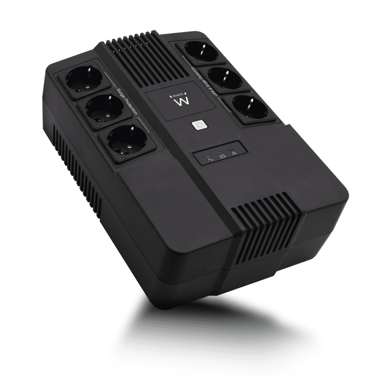 Line Interactive, 600 VA, 360 W, AVR, 6x Type F (CEE7/3) SAI EWENT INTERACTIVO DE 600VA CON AVR 6 PUERTOS CEE7/3 Proteja su PC y archivos valiosos contra fallas de alimentación y sobretensiones con el SAI Línea Interactiva de 600 VA EW3945 con AVR y protección contra sobretensiones. El SAI está equipado con 6 tomas de salida. El SAI le notifica con una alarma sonora y una notificación de LED durante un corte de alimentación. Le proporciona aproximadamente 10 minutos adicionales de carga de 120 W para guardar sus archivos y apagar su PC de manera segura. El EW3945 le protege frente a sobretensiones, cortocircuitos, descargas, excesos de carga y sobrecargas. El SAI se puede montar en la pared.Potencia de respaldo de aprox. 10 minutos a 120 W de cargaEl SAI Línea Interactiva de 600 VA EW3945 tiene 6 tomas de corriente conectadas a tierra para proteger su PC y archivos valiosos contra fallas y sobrecargas de alimentación. Tiene tres tomas de salida están equipadas con una batería de respaldo y protección contra sobretensiones. Las otras tres tomas de salida tienen protección contra sobretensiones. La batería incorporada del SAI Línea Interactiva le permite guardar sus archivos en aproximadamente 10 minutos a una carga de 120 W. La tensión de salida se mantendrá estable gracias a la función AVR.Notificaciones sonoras y LED durante fallo de alimentación.El SAI le notifica con una alarma sonora y una notificación de LED durante un corte de alimentación. El SAI también le notifica cuando la batería incorporada se está quedando sin carga. Los LED incorporados de estado le muestran el estado. El EW3945 le protege frente a sobretensiones, cortocircuitos, descargas, excesos de carga y sobrecargas.Fácil de conectarEs muy fácil conectar un PC u otro dispositivo alimentado al EW3945. Simplemente coloque el enchufe de alimentación del PC u otro dispositivo en la toma de corriente del EW3945. El SAI Línea Interactiva se puede montar en la pared y tiene un cable desmontable.