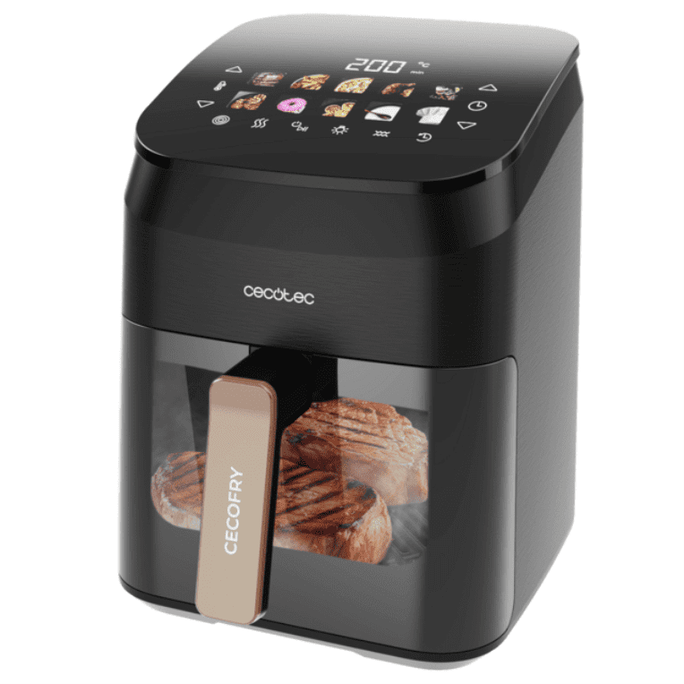 8.5 L, 10 Menus, 2300 W, 220-240V, 50/60Hz CECOTEC CECOFRY&GRILL SMOKIN’PRIME 8500 Cecofry&Grill Smokin’PrimeLa esencia de la barbacoa más sofisticadaAhúma tus recetasDisfruta del auténtico sabor a parrilla en casa, sin humos y de forma saludable. Añade chips de madera y transforma tus recetas con un toque ahumado único.Doble GrillCocción envolventeConsigue el punto perfecto en cada receta sin necesidad de voltear los ingredientes, gracias a su doble resistencia de hasta 2300 W, que asegura una cocción envolvente.Tu barbacoa en casaCecofry vuelve a innovar con su función BBQ. Este modo precalienta la cubeta para ahumar el interior y, además, permite que su parrilla alcance una elevada temperatura para sellar los ingredientes.10 menúsCocina todos tus platos con un solo toque desde su display táctil a color. Selecciona el menú perfecto o ajusta la configuración a tu gusto para obtener resultados deliciosos sin complicaciones.Control sin pérdida de calorSupervisa tus recetas de un solo vistazo sin necesidad de abrir la cubeta, gracias al innovador diseño de su ventana panorámica.Una Cecofry para cada hogarNo importa cuántos seáis o el espacio disponible, hay una Cecofry Smokin’ para cada necesidad. Elige entre 4 L , 6,5 L, 8,5 L y 11 L y cocina como a la parrilla en tu cocina.