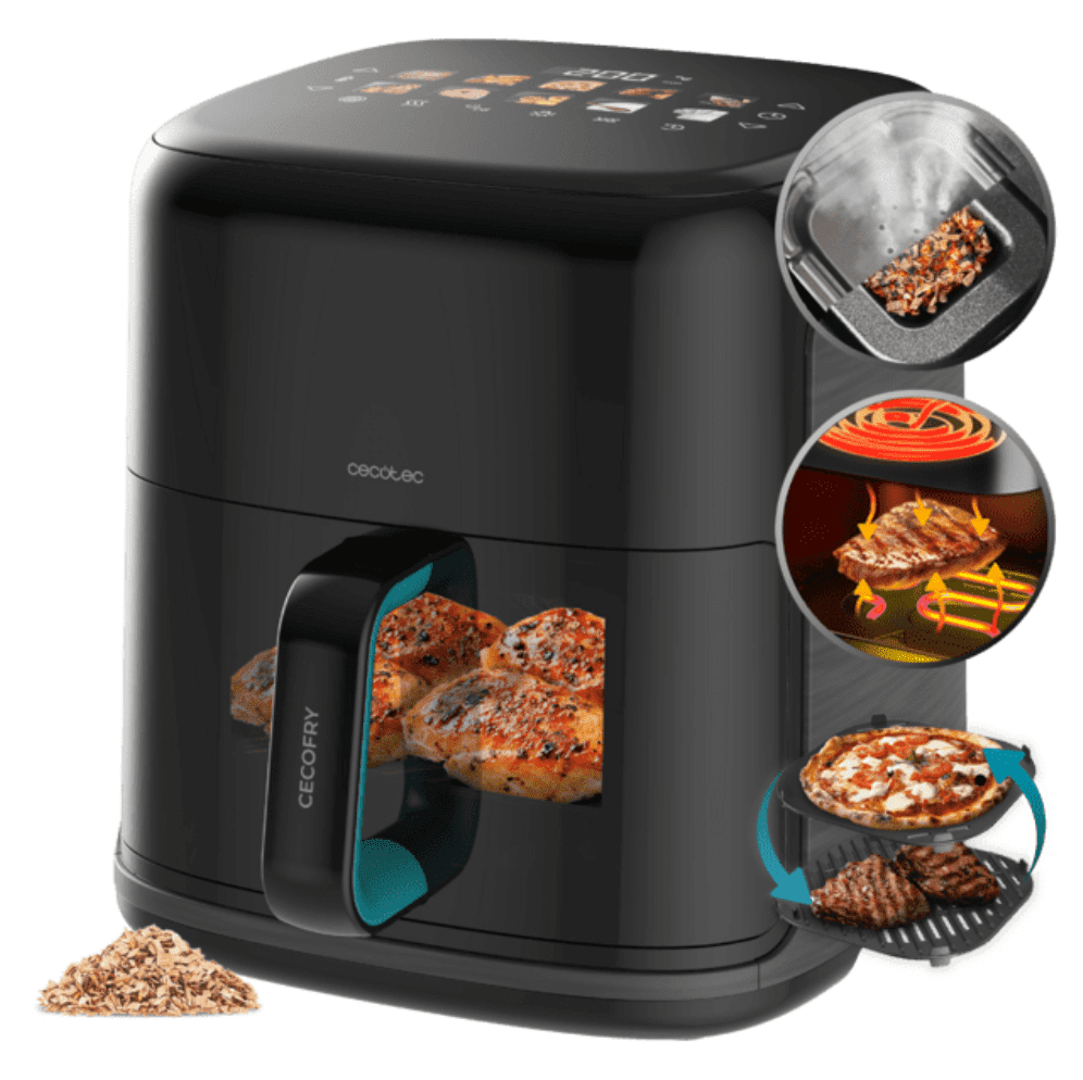 Ahúma tus recetasDisfruta del auténtico sabor a parrilla en casa, sin humos y de forma saludable. Añade chips de madera y transforma tus recetas con un toque ahumado único.Doble GrillCocción envolventeConsigue el punto perfecto en cada receta sin necesidad de voltear los ingredientes, gracias a su doble resistencia de hasta 2300 W, que asegura una cocción envolvente.Tu barbacoa en casaCecofry vuelve a innovar con su función BBQ. Este modo precalienta la cubeta para ahumar el interior y, además, permite que su parrilla alcance una elevada temperatura para sellar los ingredientes.10 menúsCocina todos tus platos con un solo toque desde su display táctil a color. Selecciona el menú perfecto o ajusta la configuración a tu gusto para obtener resultados deliciosos sin complicaciones.Control sin pérdida de calorSupervisa tus recetas de un solo vistazo sin necesidad de abrir la cubeta, gracias al innovador diseño de su ventana panorámica.Una Cecofry para cada hogarNo importa cuántos seáis o el espacio disponible, hay una Cecofry Smokin’ para cada necesidad. Elige entre 4 L , 6,5 L, 8,5 L y 11 L y cocina como a la parrilla en tu cocina.