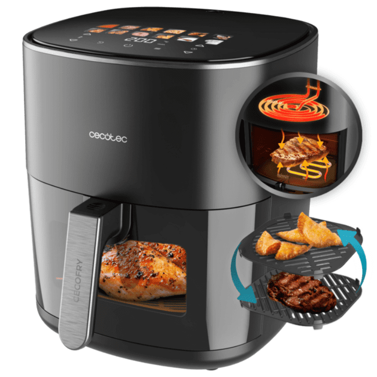 Cecofry&Grill Duoheat 6500 Air fryer Freidora de aire con doble resistencia para dorado perfecto y sabor de parrilla en carnes, capacidad de 6,5 litros y potencia de 2200 W para platos saludables. FREIDORA CECOTEC 100500 CECOFRY&GRILL DUOHEAT 65 Doble Grill y 6,5L para todoDoble grillConsigue el punto perfecto en cada receta sin necesidad de darle la vuelta a los ingredientes, gracias a su doble grill y sus hasta 2200 W, que permiten una cocción rápida y envolvente.Mucho más que una freidoraCocina a la parrilla, asa, fríe con aire, hornea, cocina y mucho más en un solo electrodoméstico. Elige el modo de cocción según la receta y disfruta de una gran versatilidad sin ocupar espacio en tu cocina.Cocina para toda la familiaPrepara recetas completas para toda la familia en una sola tanda, ahorra tiempo y disfruta de sabores irresistibles en la mejor compañía.Hasta 12 menúsCocina todos tus platos con un solo toque en su pantalla táctil a todo color. Elige el menú ideal o ajusta la configuración a tu gusto para conseguir recetas irresistibles sin complicaciones.Auténticas pizzas italianasCocina tus pizzas en su plancha y consigue que las masas queden perfectas, doradas por fuera y esponjosas por dentro, para un resultado único.Control sin pérdida de calorVigila el punto de todas tus recetas de un solo vistazo, sin necesidad de abrir la cubeta, gracias a su ventana integrada en el exterior.