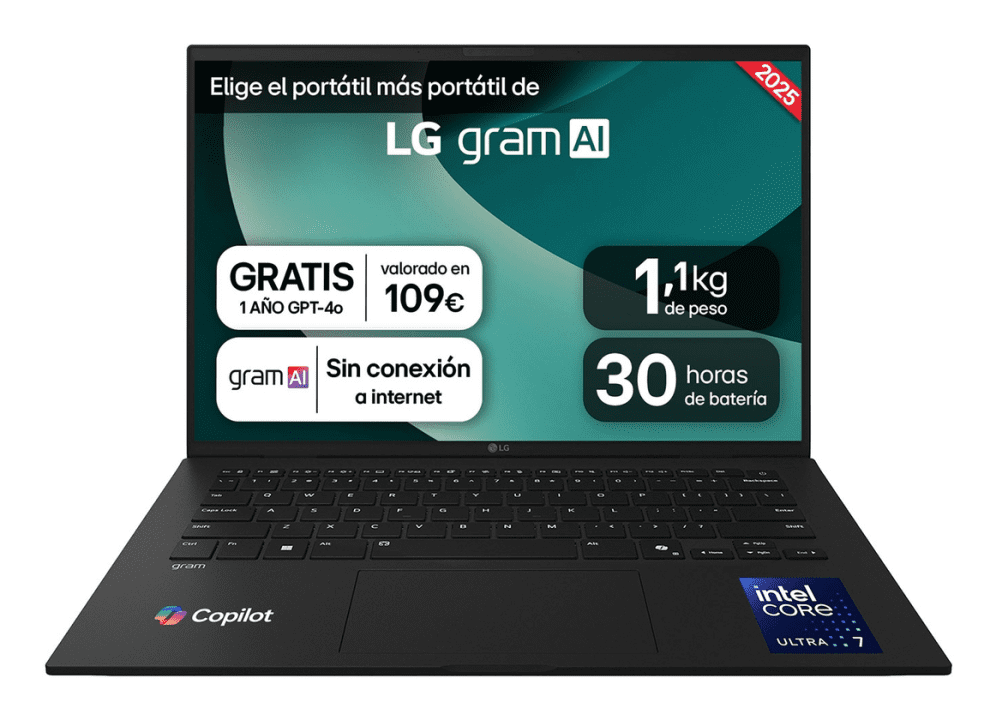 gram AISinergias entre tu dispositivo y la nubeGracias a la AI en el dispositivo (Chat On-Device) y en la nube (Chat Cloud), gram AI ofrece un rendimiento fluido e información personalizada donde quiera que estés. Trabaja de forma más inteligente, sientete seguro y consigue más, estando conectado o desconectadoSiempre activo, incluso sin conexión con Chat On-Device- Vuelve sobre tus pasosRecupera tus archivos perdidosgram Chat On-Device examina tu navegación y datos guardados en tu LG gram para ofrecerte recomendaciones adaptadas a tus necesidades.- BúsquedaConsigue respuestas personalizadas en función de tus archivosProporciona recomendaciones personalizadas basadas en datos locales de tus documentos e imágenes.- ResumenResúmenes rápidos, incluso sin internet.Resume archivos de texto o documentos directamente en el dispositivo.- AjustesCambia los ajustes con tus palabrasConfigura varias opciones del sistema en gram chat On-Device con sencillos comandos conversacionales.- Solución de problemasAsistencia 24/7 en cualquier momento y lugar.LG gram ofrece asistencia instantánea 24/7 para consultas sobre productos, incluso sin Wi-Fi.Un asistente inteligente con Chat Cloud AI- Q&A ChatbotTu asistente inteligente de AIResuelve todo tipo de cuestiones hasta satisfacer tu curiosidad, el asistente de AI te ofrece la información que necesitas en cuestión de segundos.- Documento AIDesde una simple traducción hasta un sencillo resumenDeja a la AI analizar y extraer detalles clave de tus documentos, ahorrando tiempo y esfuerzo- Función de llamadaGestiona tu día a día con AIPrograma y envía correos electrónicos sin esfuerzoLigerezaCon solo 1,120 g de peso combinado con un grosor de 15,7 mm, LG gram se adapta libremente a cualquier estilo de vida. Diseñado para superar rigurosas pruebas militares, este diseño demuestra que la durabilidad y la elegancia pueden ir de la mano.Alta resolución WUXGA y amplia gama cromática DCI-P3 99% (Typ.)Detalles nítidos, experiencias vívidasSumérgete en colores vivos con la resolución WUXGA y la amplia gama de colores DCI-P3 99%. LG gram da vida a tus ideas, añadiendo precisión y profundidad a cada imagenPantalla 16:10 de 14 pulgadasDisfruta de cada momento visualAumenta tu productividad con una visión más amplia. La relación de aspecto 16:10 te ofrece un campo visual más amplio, para que puedas desplazarte menos y centrarte más. Con una cobertura de color DCI-P3 99%, disfruta de detalles vibrantes y colores vivos e intensos.Pantalla antirreflejos Enfócate y ve más allá.Disfruta de una pantalla nítida y colorida sin preocuparte por los reflejos, incluso en entornos luminosos.Auténtica libertad para la multitareaPotencia tu productividad con el procesador Intel® Arrow Lake El último procesador Intel Arrow Lake , que incluye una Unidad de Procesamiento Neural (NPU) capaz de manejar hasta 13 teraoperaciones por segundo (TOPS) para tareas de AI, ahora está integrado en el LG gram, ofreciendo un rendimiento potente optimizado para portátiles. Con una eficiencia energética innovadora y el rendimiento distintivo de un procesador dedicado a la AI, maneja de manera eficiente las tareas de AI y aprendizaje automáticoMultitarea fluida y rápidaObtén lo mejor de la AI y del procesador con memoria LPDDR5X para un manejo de datos rápido y SSD NVMe duales¹¹ para un acceso rápido a su almacenamientogram LinkConecta todos tus dispositivosLG gram Link permite conectar hasta 10 dispositivos a la vez, incluso iOS y Android. Comparte, colabora y crea con un espacio de trabajo conectado sin límitesTransferencia de datos- Transferencia de datosFácil transferencia de datos entre el LG gram y tu smartphone (Android e iOS).- Ampliación y duplicación de pantallasUtiliza tu tablet o smartphone como segunda pantalla.- Clasificación de imágenes AILa AI se encarga automáticamente de clasificar y etiquetar las imágenes.- El teléfono como webcamUtiliza la cámara de alto rendimiento de tu smartphone para realizar videollamadas.- Comparte el audio con tu teléfonoComparte el sonido de tu smartphone directamente con los altavoces de LG gram.- Haz y responde llamadasRealiza y recibe llamadas directamente desde tu LG gram- Duplicación de pantallaProyecta la pantalla de tu tablet o smartphone al gram.- Fluye entre dispositivos con el teclado y el ratónControla tu tablet o smartphone con el teclado y el ratón de tu gram.Dolby AtmosExperiencia de audio inmersivaLos paisajes sonoros cobran vida. La tecnología Dolby Atmos te envuelve en una aventura auditiva de 360 grados.Energía inteligente, desconecta y juegaImpulsado por una batería de alta capacidad de 72Wh que ofrece hasta 30.0 horas de batería y equipado con nuestro Asistente Inteligente AI, gram analiza los patrones del usuario para optimizar la eficiencia de la batería. Aumenta tu productividad y disfruta de un juego ininterrumpido.Fácil conectividadConectividad sencilla e instantáneaConéctate con LG gram +View, monitores más grandes, dispositivos de última generación odispositivos de almacenamiento de alta velocidad. Sus numerosos puertos lo convierten en un paraíso plug-and-play de mayor productividad y entretenimiento sin fin.