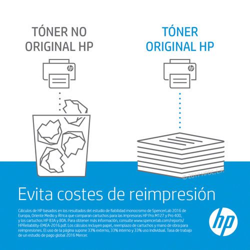 Los cartuchos de tóner Originales HP con JetIntelligence ofrecen páginas de calidad profesional, opciones de alta capacidad,[2] un máximo rendimiento de impresión y la innovadora tecnología antifraude de HP. Reduce los costes con el tóner HP EcoSmart negro de bajo consumo.[1]